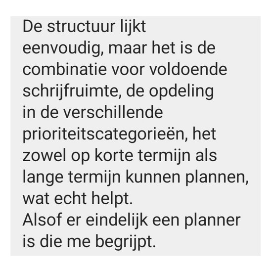 Rechts noteer je je taken per categorie, links plan je ze in over de dagen van de week en kan je ze ook nog eens rangschikken per prioriteit in de kolommen.